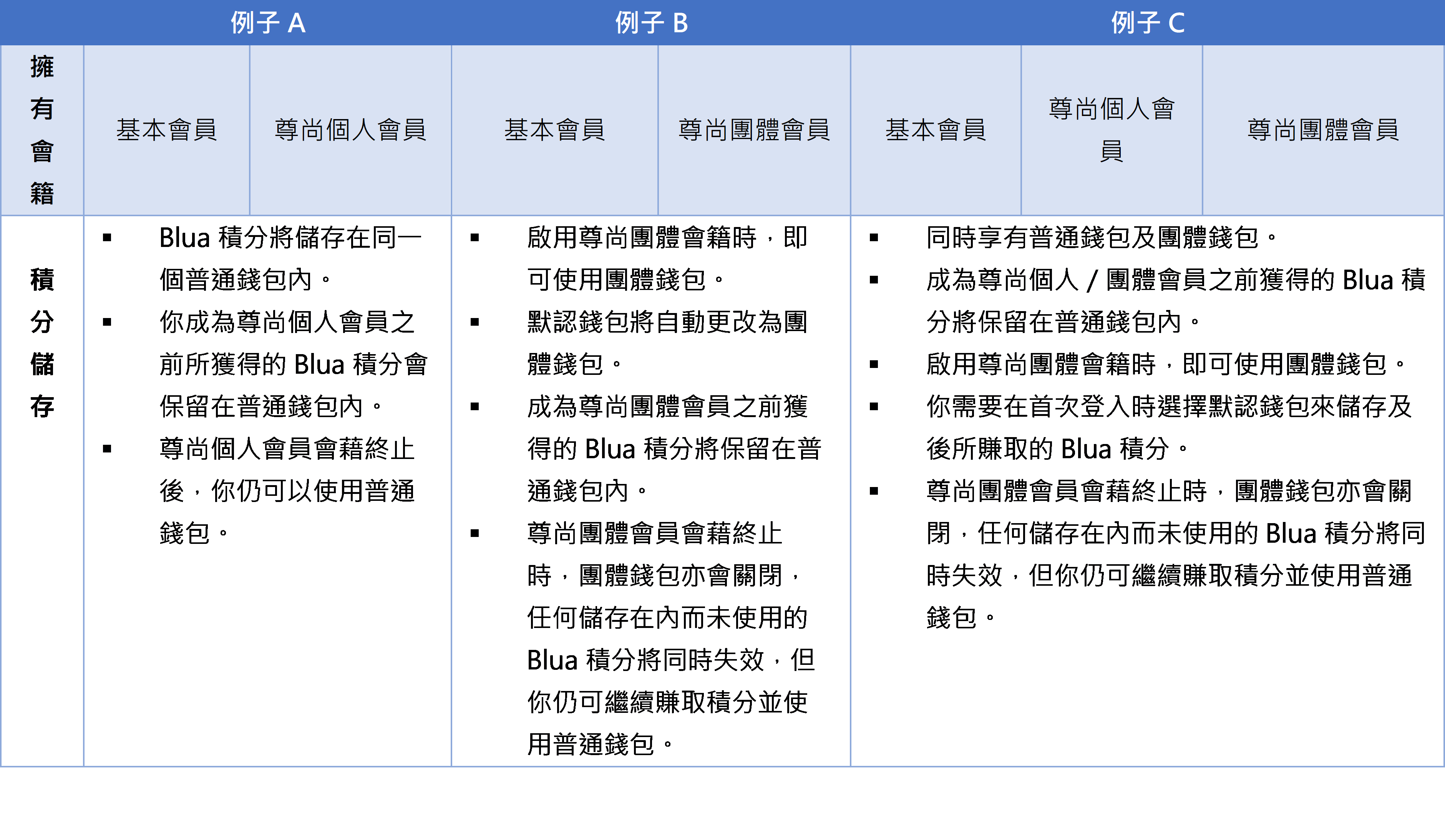 如若你同時擁有多個會籍,Blua積分在特定情況下可被儲存在不同的錢包內。以下列表僅提供例子作為闡術: