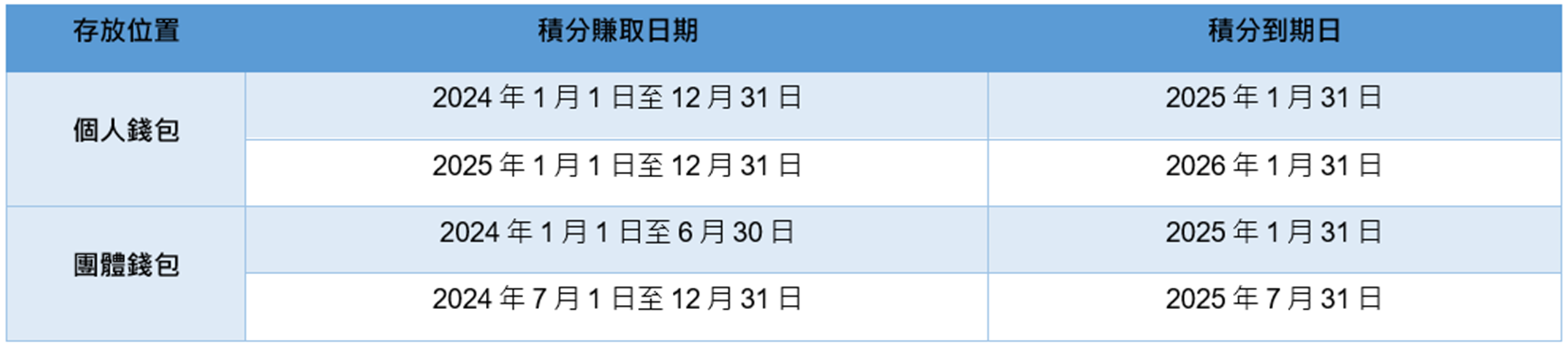 適用於基本會員及尊尚(個人)會員:儲存在個人錢包內的積分到期日為下一年度的1月31日。