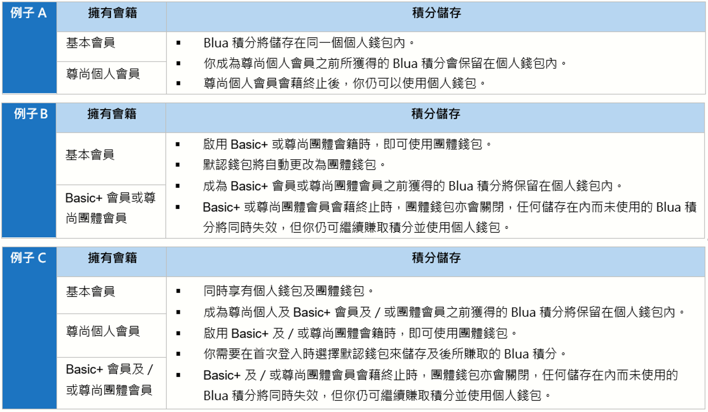 如若你同時擁有多個會籍,Blua積分在特定情況下可被儲存在不同的錢包內。以下列表僅提供例子作為闡術: